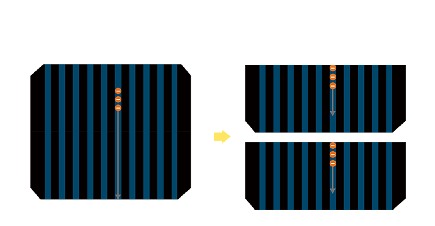 • 多條電極柵結構,可有效降低外力對於電池的影響,限制電池隱裂 (Micro-cracks) 範圍,防止電流傳輸路徑 (Current distribution) 之損壞進一步擴大。
